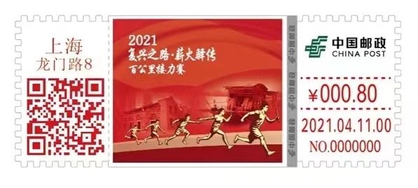 为纪念此次赛事,上海邮政特地申请发行《2021复兴之路·薪火驿传百公里接力赛》TS71型邮资机宣传戳1枚,并于赛事当天同步启用。