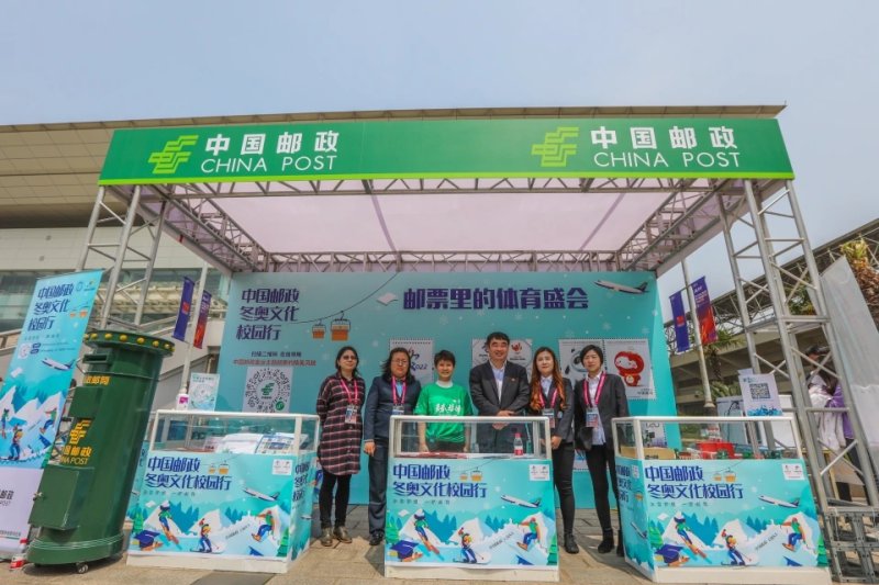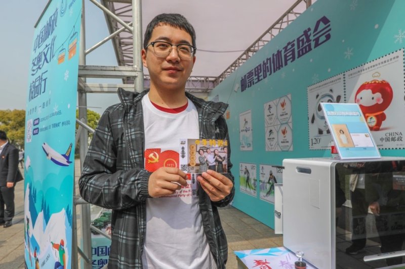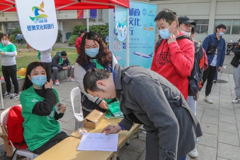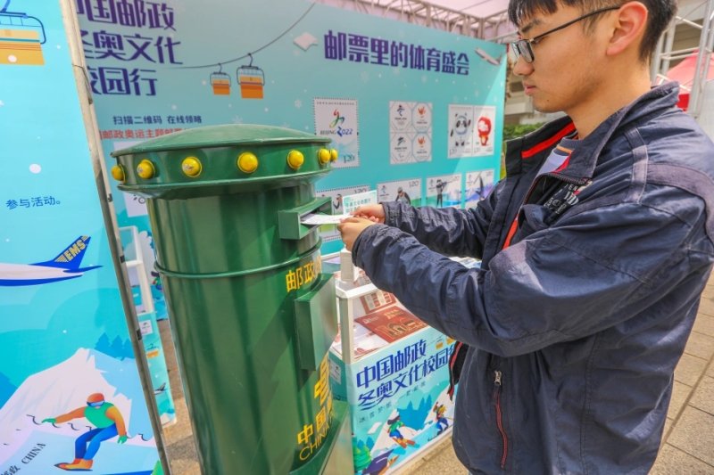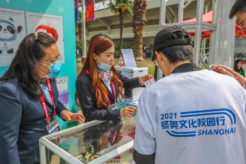 在上海大学活动现场,上海邮政特地新设置了“邮政冬奥展台”,不仅展示了各类邮品,同学们也可以将手机里的照片现场打印制作成为一张特殊的明信片,投入邮筒内即可寄出。