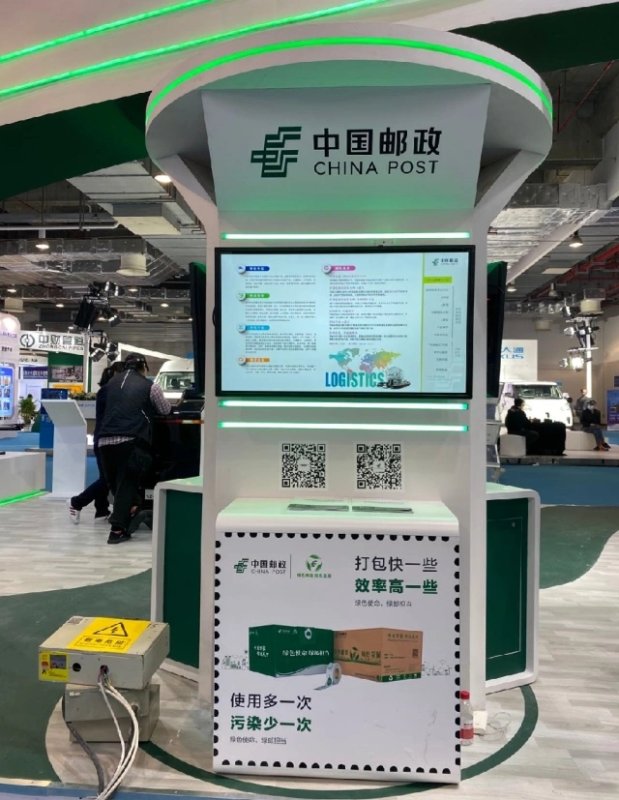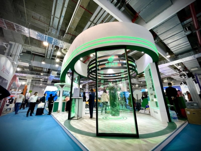△邮政展位采用了“三流合一”和“四梁八柱”的基本设计理念,利用上海邮政大楼作为四扇导光旋转门的线稿背景、通过绿色及亮绿色光带,突出邮政科技感、现代感、流线感,着力打造数字化物流体系