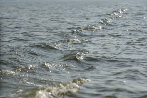 行船在洪湖水上。翻涌的浪花仿佛在向人讲述当年的景象。