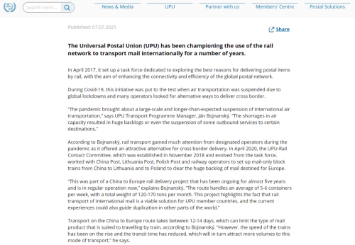 此外,在6月9日召开的2021年万国邮联—国际铁路组织论坛第一次会议上,邮政EMS与铁路公司间的CARDIT/RESDIT信息传输测试提案也得到了与会成员的积极反馈,具体测试工作将于2021年底或2022年初开展,会议将进一步推进中欧班列发展。