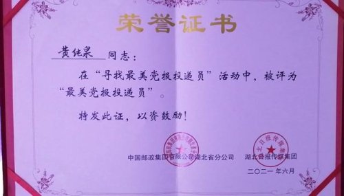 7月20日,荆州市邮政分公司相关负责人告诉记者,在中国共产党百年华诞之际,黄纯泉获得湖北日报、湖北省邮政分公司联合表彰的“最美党报投递员”称号,属荆州市唯一。记者立即联系到了黄纯泉。