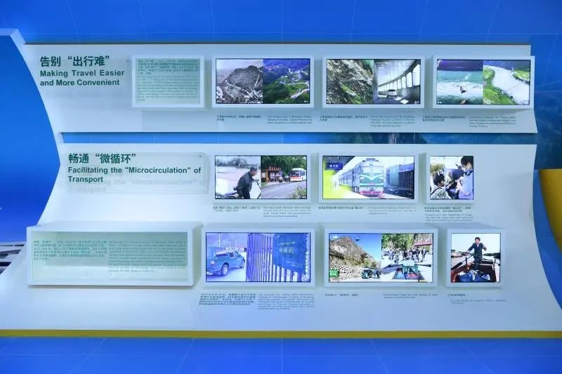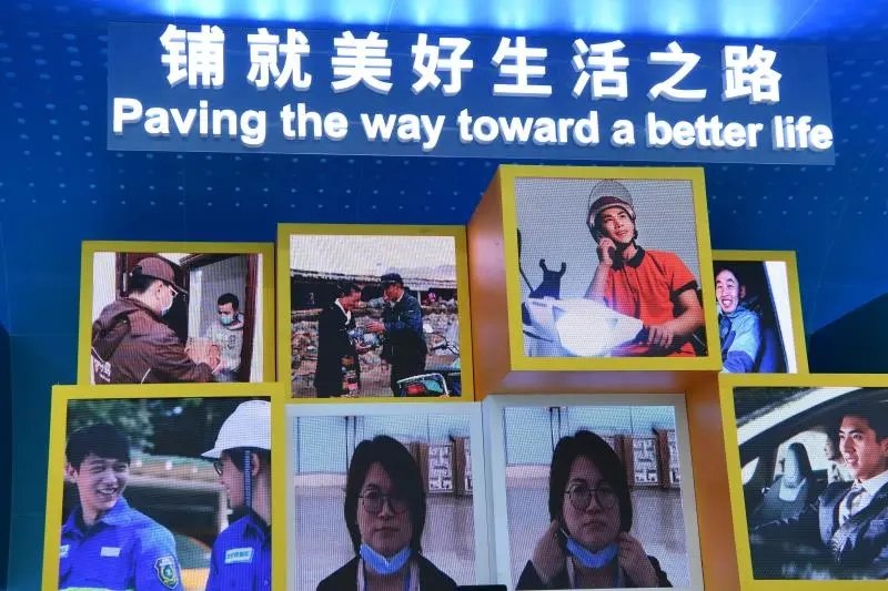 在可持续交通与民生板块,“铺就美好生活之路”的主题下有一面动态展示的照片墙,西藏海拔最高行政乡普玛江塘乡投递员次仁曲巴投递邮件时的笑脸就在其中。