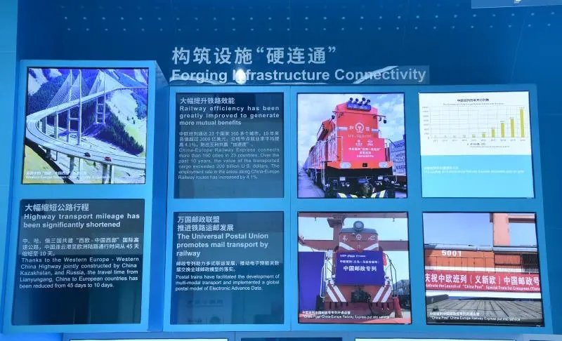 在构筑设施“硬连通”部分,万国邮政联盟推进铁路运邮发展的文字介绍旁,是中欧班列中国邮政号的身影。