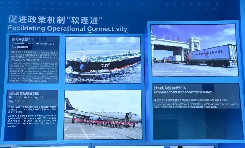 促进政策机制“软连通”部分则介绍了推动航空运输便利化的情况,并展示了中国邮政开通“上海-东京”国际货运包机航线。