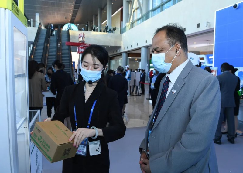 网点远程服务设备用品柜内,可重复使用的封套、循环包装箱、纤维素可降解胶带、免胶带封装箱等邮政绿色环保包装用品,让参观者直观感受到了中国邮政的智能、环保、可持续。