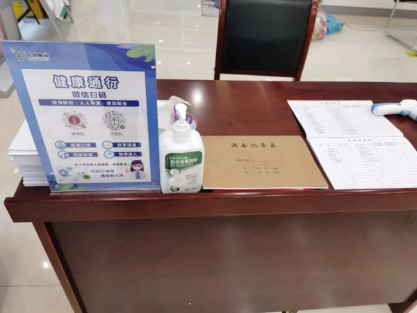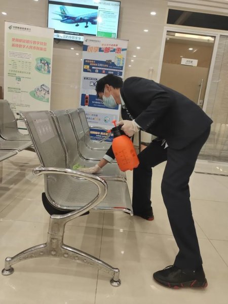 在营业厅内,工作人员为每一位进入大堂办理业务的市民做好信息登记,测量确认体温正常后,才放行。网点工作人员主动对人员频繁接触部位以及营业场地进行喷雾消毒,并且在大堂柜台为客户提供免洗洗手液等防疫物品,张贴防疫温馨提示。