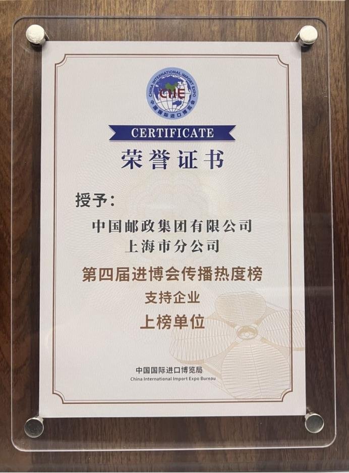 其中,中国邮政集团有限公司上海市分公司喜获“第四届进博会传播热度榜”支持企业上榜单位荣誉称号!