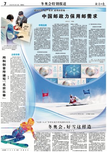 在弘扬优秀传统文化和奥林匹克文化的同时,中国邮政在邮票印制中引入先进的科技手段,以崭新的形式呈现北京冬奥会的精彩魅力。以《北京2022年冬奥会——竞赛场馆》纪念邮票小型张为例,首次应用菲涅尔透镜微纳光刻技术。国家速滑馆建设所用的剩余玻璃材料经过特殊工艺加工成50微米的可用颗粒,掺入红色雕刻油墨中,制作成“冰丝带特种油墨”。在紫光灯下,方寸间的场馆可以立即呈现出“冰丝带”霓虹璀璨、光影流转,场馆周围灯火辉煌的夜景。“冬奥会邮票邮品设计精美,很受欢迎,极大地满足了各国运动员和来宾的需求。”国家邮政局局长马军胜说。
