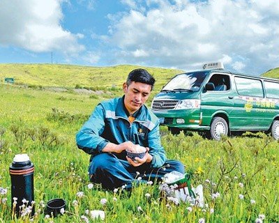 哈弄夺机在邮递途中吃午餐。张津摄
