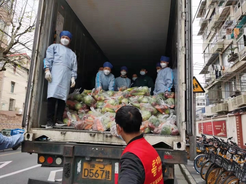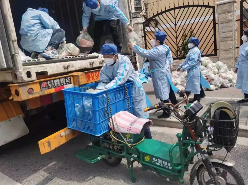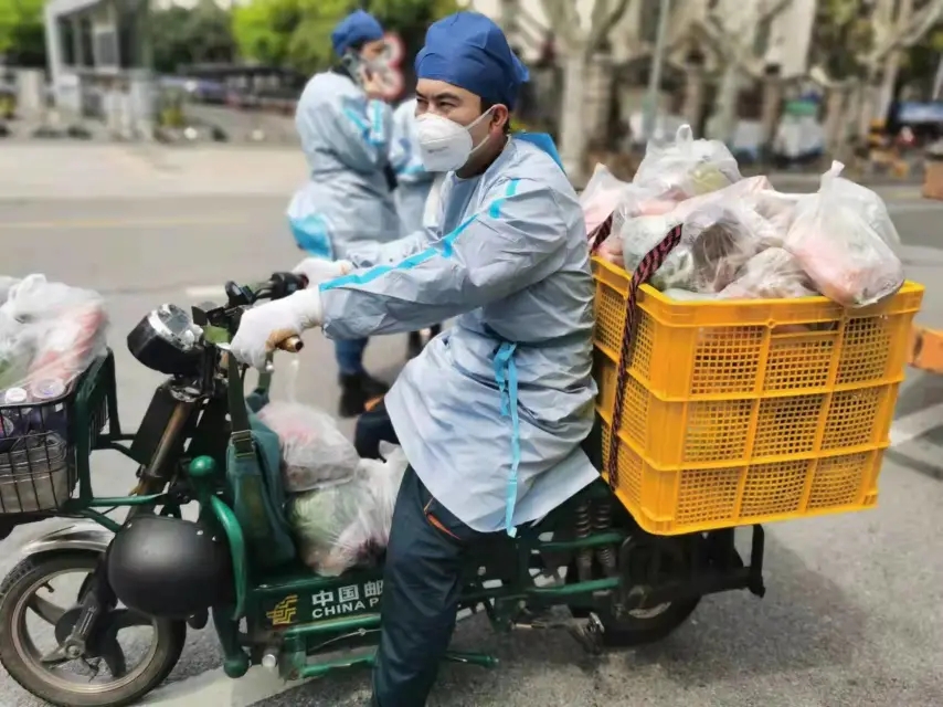 彼时,天山街道正为30吨的蔬菜配送发愁,他们提前预约的货拉拉和志愿者都无法如期到场。于是,天山路支局积极响应上海邮政提出的“抗疫情、保通畅、保民生”的要求,共组织了4辆邮车、12部电瓶车、19名投递员参与天山街道的防疫保供物资配送工作。