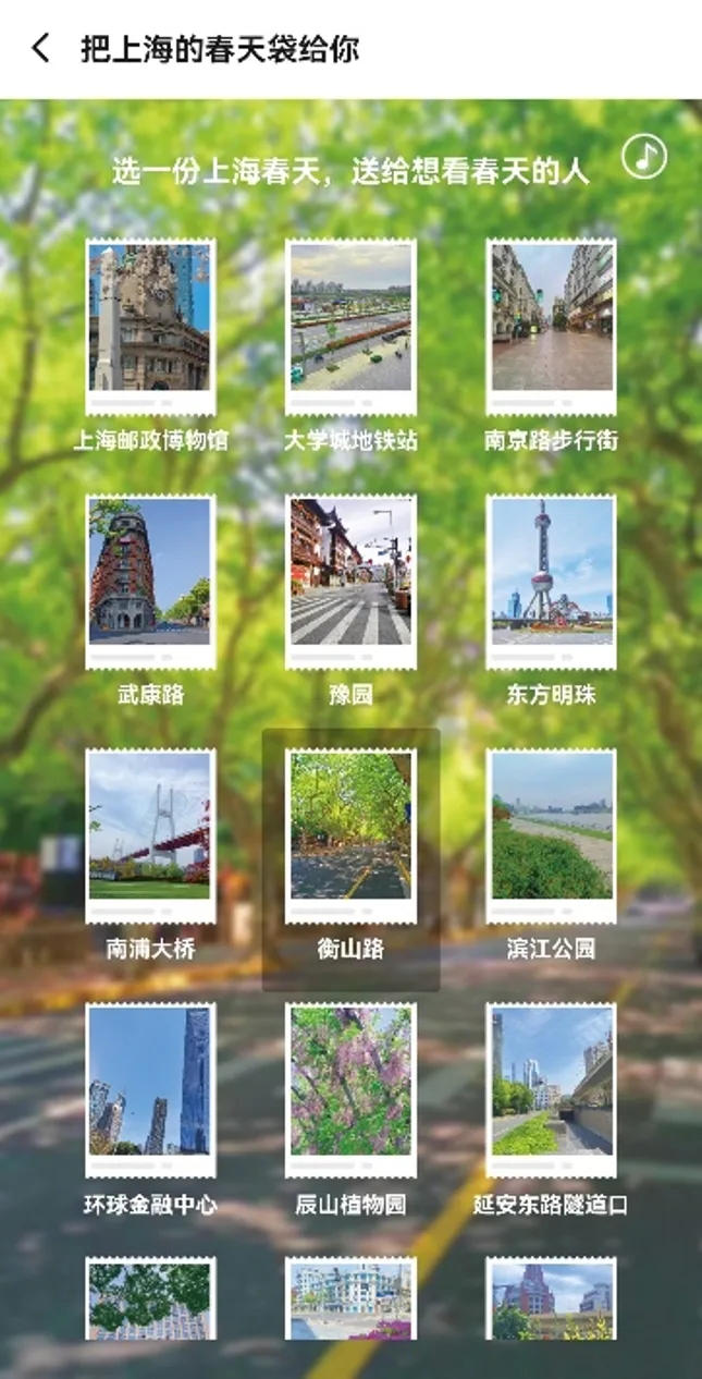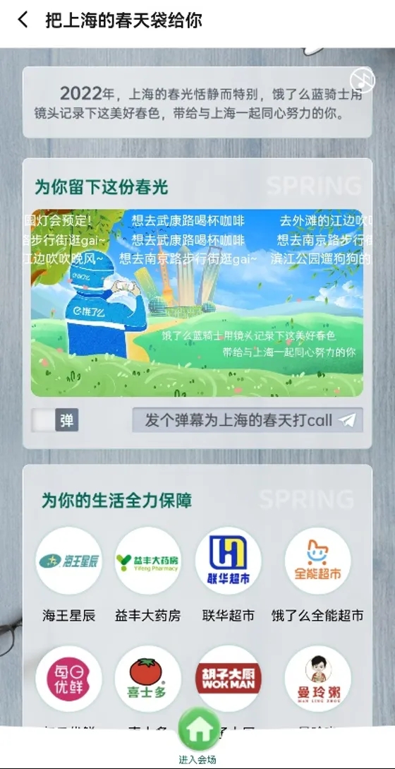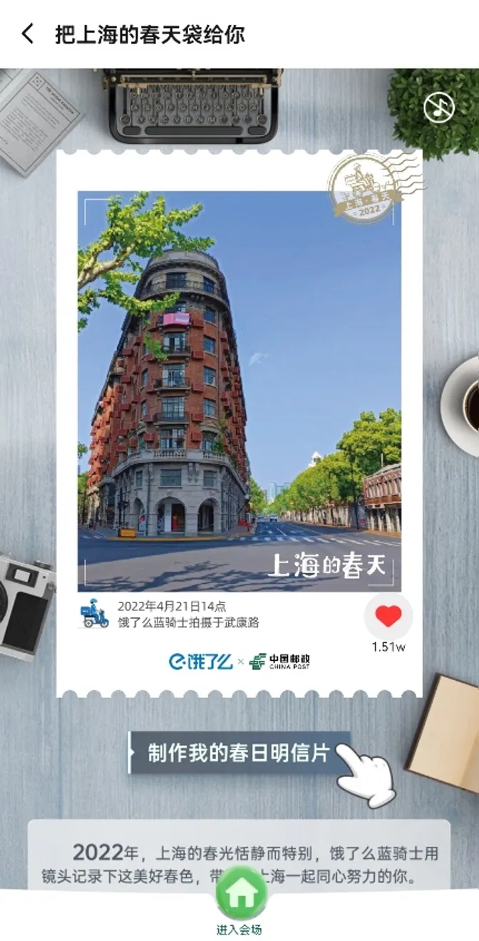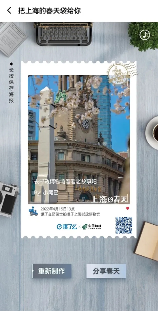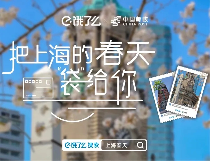 除此之外,小伙伴们也可以在饿了么平台搜索“上海春天”,即可生成一枚虚拟明信片