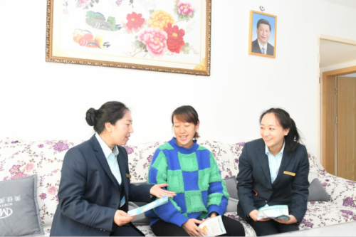 采访组刚刚走出综合便民服务站,就遇到了正在社区外拓的土比妞牛。沐恩邸是土比妞牛常来的地方,她所在的人民路邮政所是昭觉县唯一的邮政金融网点,服务范围覆盖2557.21平方公里,惠及20余万老百姓。