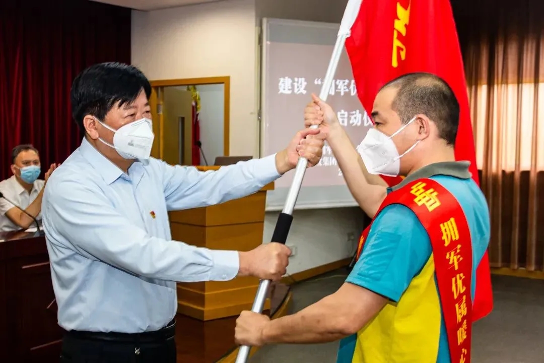△启动仪式上,金山区会会长曹云辉向金山区分公司“拥军优属暖心邮路”志愿者服务队授旗。