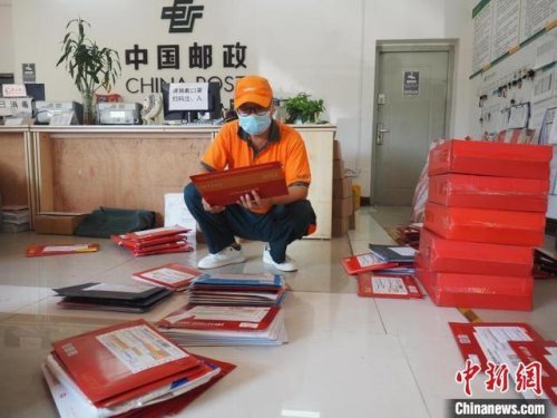 7月24日上午,中国邮政柳州分公司南站营业部,邮递员韦昌燊对录取通知书进行分拣工作。 李娇阳 摄