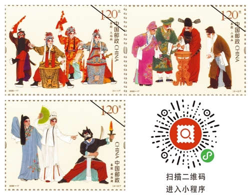 该套邮票全套3枚,邮票图案名称分别为“火焰驹”“三滴血”“游西湖”。邮票选取了《火焰驹》《三滴血》《游西湖》3部秦腔经典传统剧目的精彩片段,分别表现了铜锤花脸、文武小生、丑角、老生、小生、小旦等典型戏曲人物形象,原画为绢本设色,采用中国传统工笔画法,运用粗犷的线条、浓烈的色彩,以呼应秦腔独特的艺术风格,同时结合淡雅的背景,烘托前景重彩戏曲人物,增添了画面的古风雅韵。