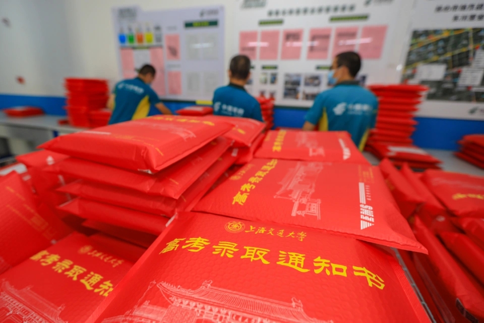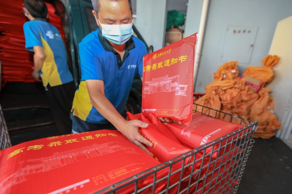 据了解,今天,上海市第一批送达的录取通知书分别是上海交通大学和上海同济大学。根据各个学校录取批次不同,录取通知书的投递时间将持续到8月下旬。今年上海市投递的高考录取通知书预计在5万封左右。