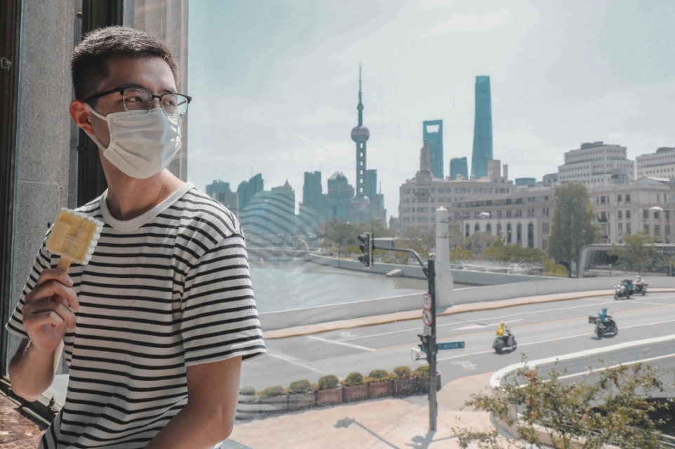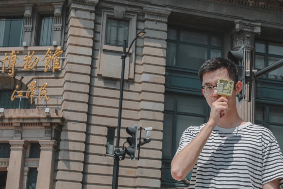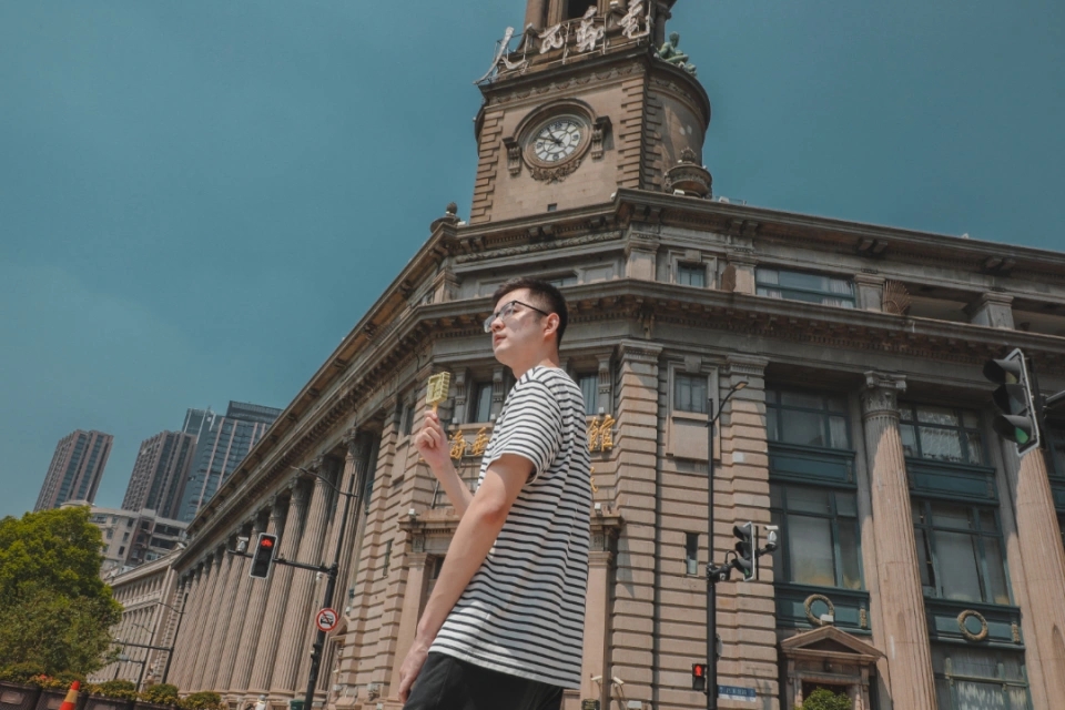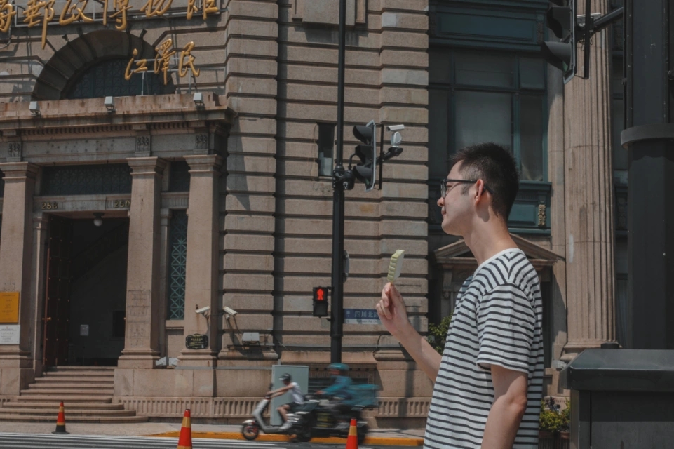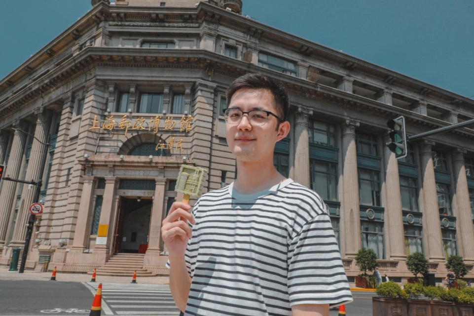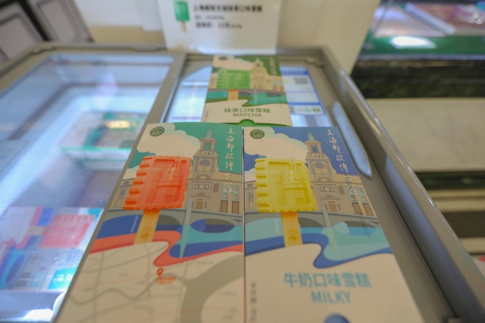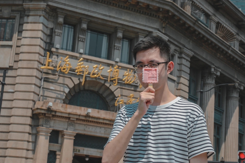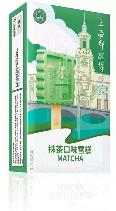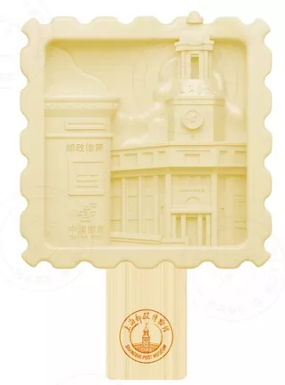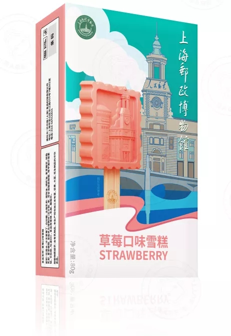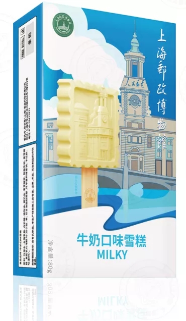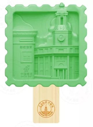 文创雪糕造型以邮票的外形融合苏州河畔的邮筒、上海邮政总局大楼、天空中飘扬的云朵,营造出一幅美丽的风景画。