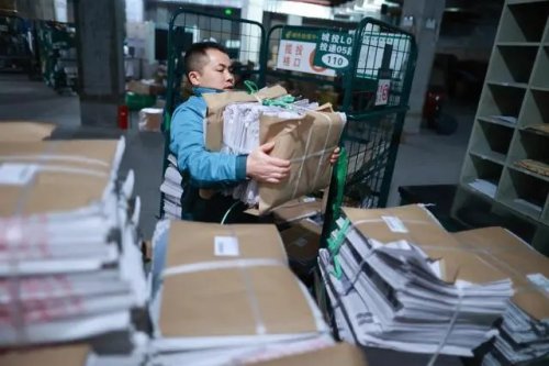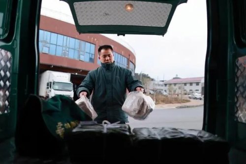 在贵州省龙里县草原路邮政邮件处理中心外,莫富元将当天需要投递的物品拿上小货车(2月14日摄)。