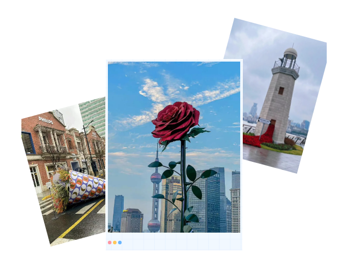 比如最近很火的:外滩BFC的巨型玫瑰、张园的巨型手捧花、北外滩的玫瑰瀑布