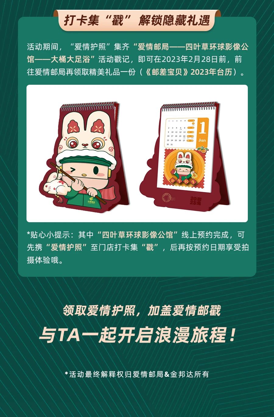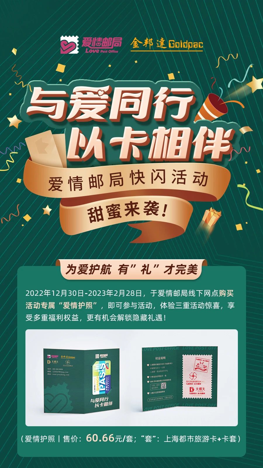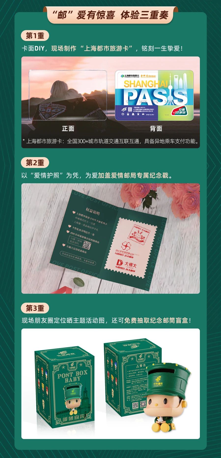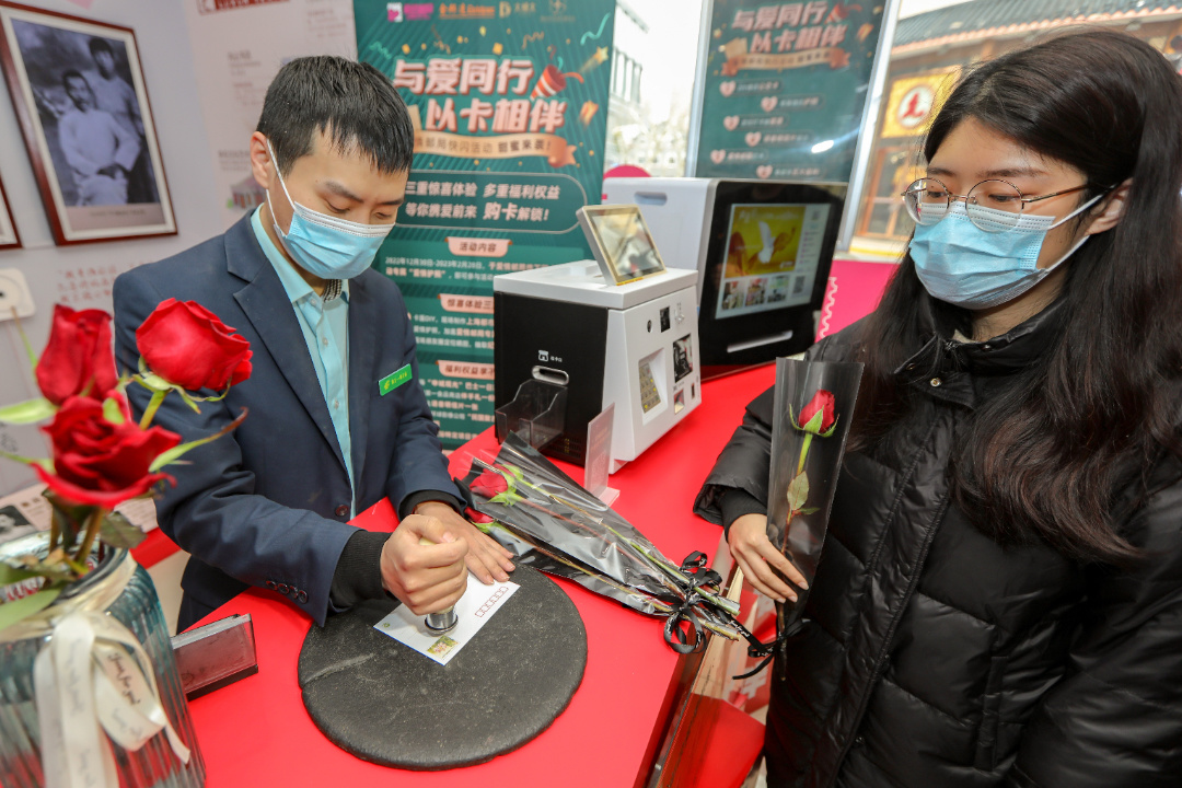 作为上海唯一的爱情主题邮局,为迎接佳节到来,本着见证爱情,传递幸福的主题理念,在情人节来临之际,上海爱情邮局携手金邦达共同推出“与爱同行,以卡为伴”快闪活动,让大声说出的爱意穿越时限,留下满满的甜蜜回忆。据了解,即日起至2023年2月28日,市民游客只需在爱情邮局线下网点购买活动专属的“爱情护照”就可以参与活动,情侣们不仅能为“爱情护照”加盖爱情邮局的专属纪念戳,更能在现场DIY“上海都市旅游卡”卡面、制作个性化语音爱情明信片,为TA、为自己铭刻下一生的挚爱。