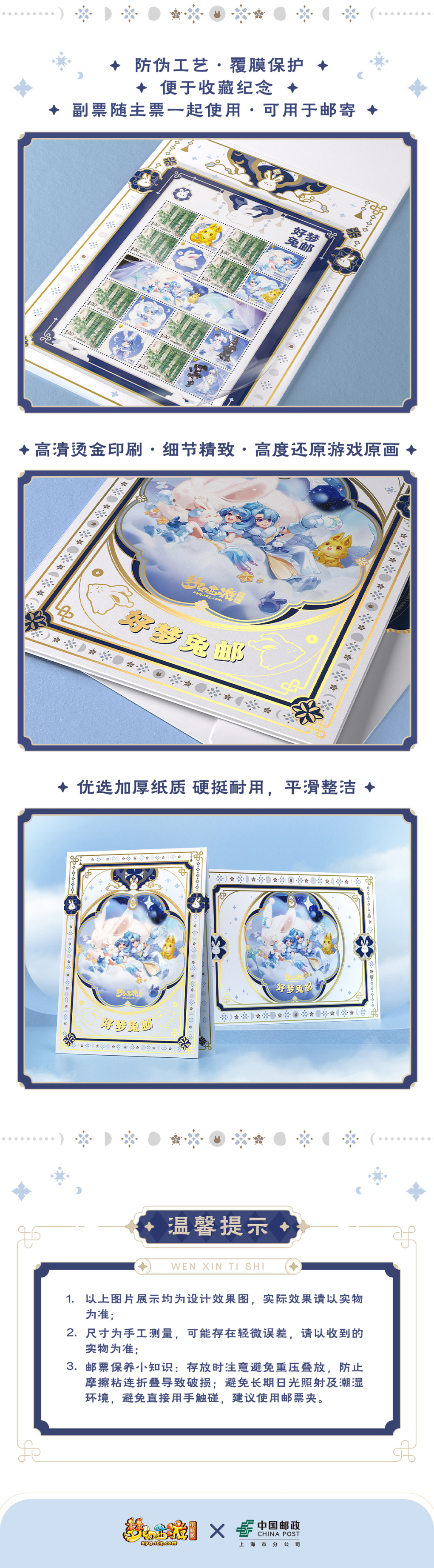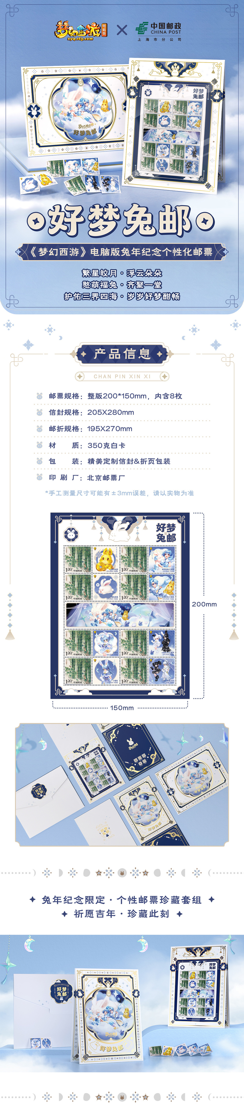 邮票作为信件邮寄时的“邮资凭证”一直以来都是书信的重要组成部分,时至今日邮票逐渐演变为了收藏品。本次《梦幻西游》与上海邮政联动推出的兔年纪念个性化邮票就是一份精美的收藏品,上海市邮政分公司集邮与文化传媒部表示,希望用这种联动的方式让邮票以年轻、潮流的形式展现在大家面前,潮流邮票将美好的新年祝福寄出,让更多人感受书信的浪漫。