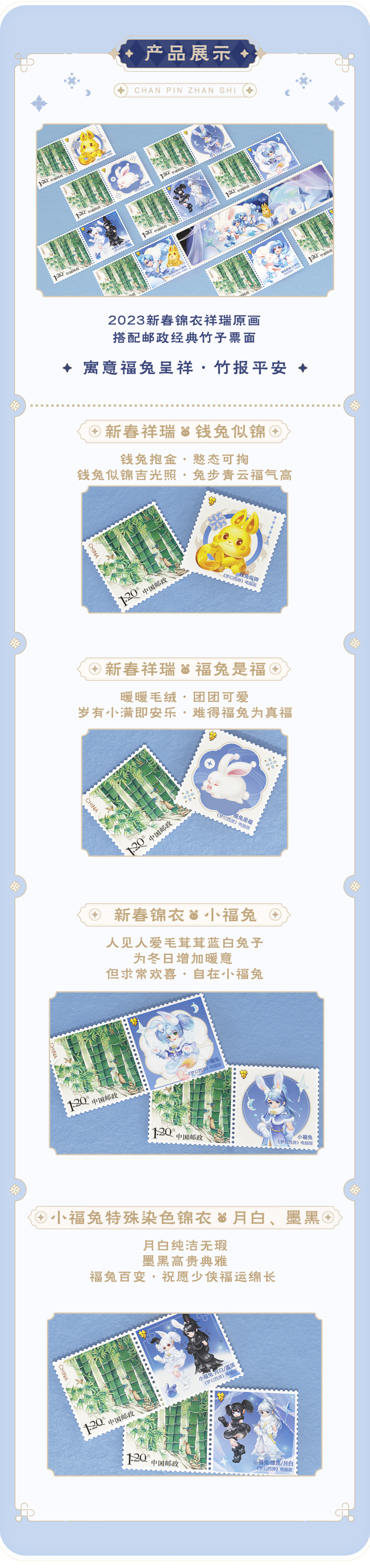 本次联动推出的《梦幻西游》兔年纪念个性化邮票主图是青葱的竹林。大家都知道,在日常生活出现的吉祥图案中,竹子是很常见的,最熟知的便是与松、梅,构成“松竹梅岁寒三友”。同时,竹谐音“祝”有祝福之意,竹子一节节的枝干更是被赋予了节节高升的寓意。从古至今,在人们心中竹子的美好品质都是被公认的,它不仅代表着顽强的生命力,更是长寿安宁、幸福和谐的象征。正值兔年,邮票本体用兔子与竹作为主要元素,在展现新年氛围的同时也将吉祥如意的美好祝福镌刻在其中。