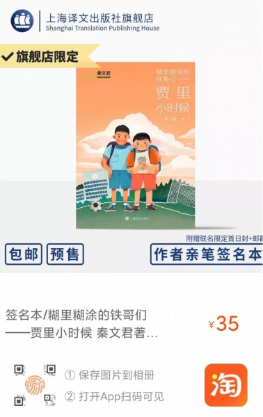即日起,线上购买图书《糊里糊涂的铁哥们——贾里小时候》即可获得《糊里糊涂的铁哥们——贾里小时候》纪念邮品纪念邮封和邮戳。还有机会抢到秦文君老师亲笔签名的图书哦!