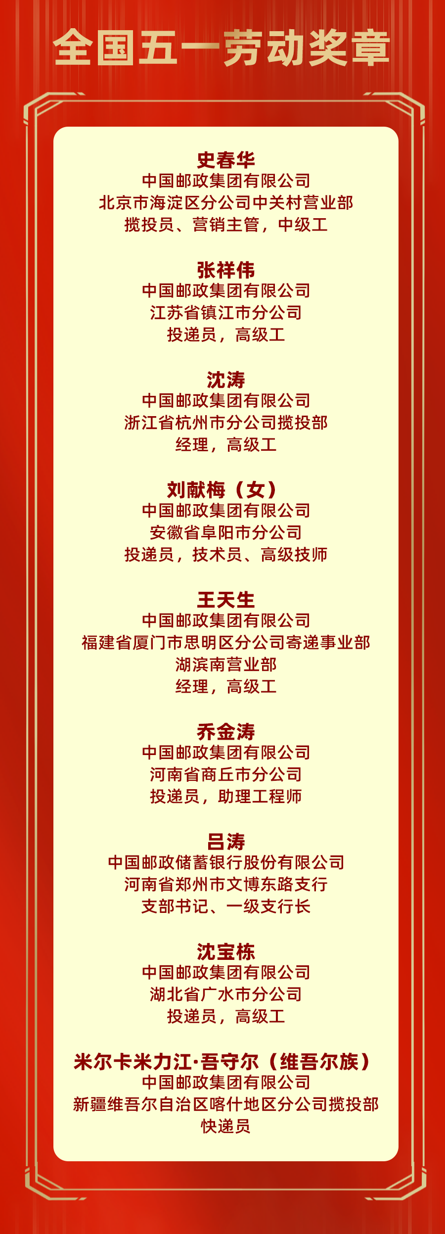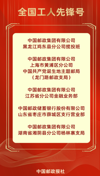 4月27日,中华全国总工会在京召开2023年庆祝五一国际劳动节暨全国五一劳动奖和全国工人先锋号表彰大会。207个集体和1035名个人分获全国五一劳动奖状、奖章,1044个集体获全国工人先锋号。其中,全国邮政系统9名个人获全国五一劳动奖章,5个集体获全国工人先锋号,中国共产党诞生地主题邮局获全国工人先锋号。