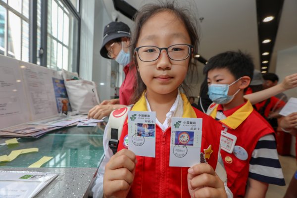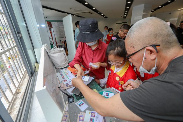 △在首发仪式上的集邮文化传承环节,《小主人报》的小记者们现场采访资深集邮媒体撰稿人谢刚。