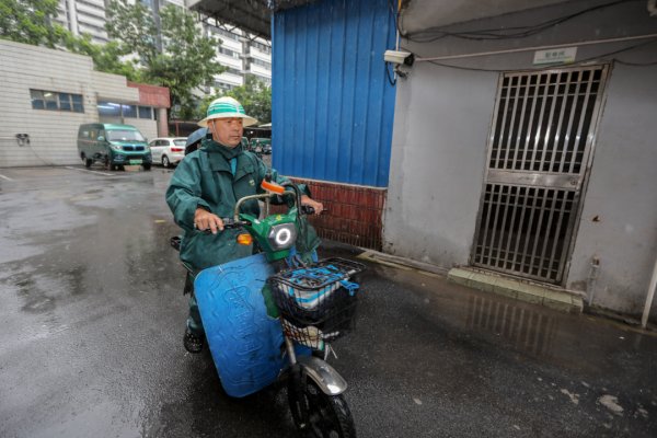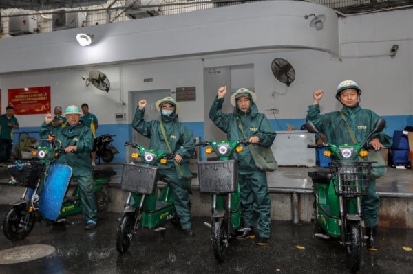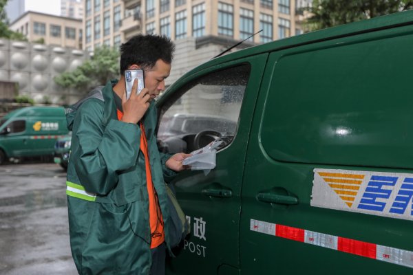 △为应对暴雨天气,邮递员特地给邮件套上透明防水袋。