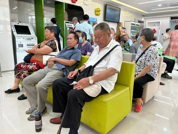 67岁的许月华阿姨早上7点半就来领养老金了,本来以为要等到银行8点开门才能进去,没想到能直接进入营业厅里坐着等候。“一般这个时候银行都还没开门,邮政工作人员担心我们在外面太热,所以提早开门让我们待在空调间里。”