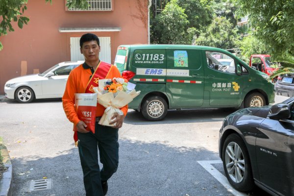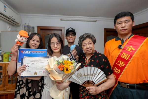 然而,家住曲阳路的陈诗雨同学此时的心情也像三伏天的气温一般无比灼热。因为,就在中午12点30分,全国劳动模范、邮政EMS揽投员柴闪闪将一封来自上海外国语大学的录取通知书送到她的手中,这也是上海邮政今年收寄并送出的首封高考录取通知书。