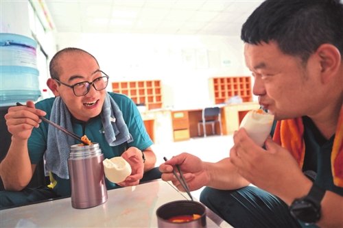 许桂明和同事插空吃简单的午饭。