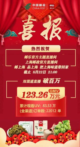 不少网友在直播窗口下方激动评论“超级划算!秒杀太快了!”“有福利,更有惊喜!”“好大米!好月饼!好水果!还能包邮送到家”直播一开场,观看粉丝人数迅速上涨,通过双直播间直播,当天邮乐app累计观看UV达83.53万,订单数超2.2万,截至8月22日21点,共形成销售额120余万元,其中上海邮政官方首秀累计订单达1.3万余单,销售额超72万元。