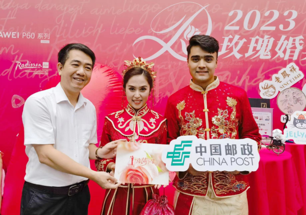 △在本次活动的保留环节——玫瑰证婚仪式上,上海市邮政分公司副总经理徐永淼特为新人们送上了定制邮品和纪念封,为爱见证。