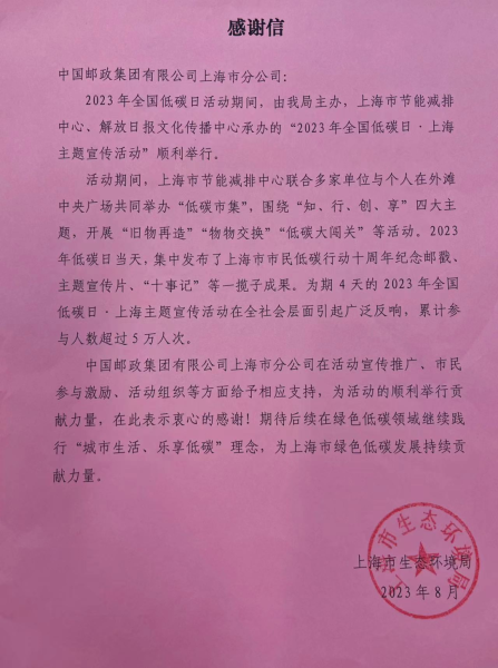 此外,上海市邮政分公司也在近日收到了一封来自上海市生态环境局的感谢信。信中对上海邮政在2023年全国低碳日·上海主题宣传活动中的共同努力和辛勤付出表示感谢。