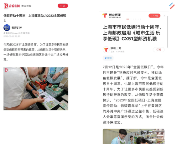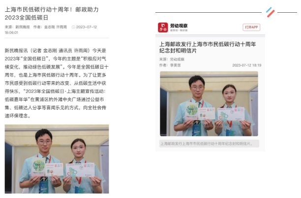 日前,上海电视台看看新闻、广东电视台触点新闻、《劳动报》《新民晚报》《中国邮政报》《中国邮政快递报》等多家主流媒体纷纷报道了上海邮政助力2023年全国低碳日,积极履行社会职责、践行绿色低碳生产生活方式、共同推动绿色低碳发展。
