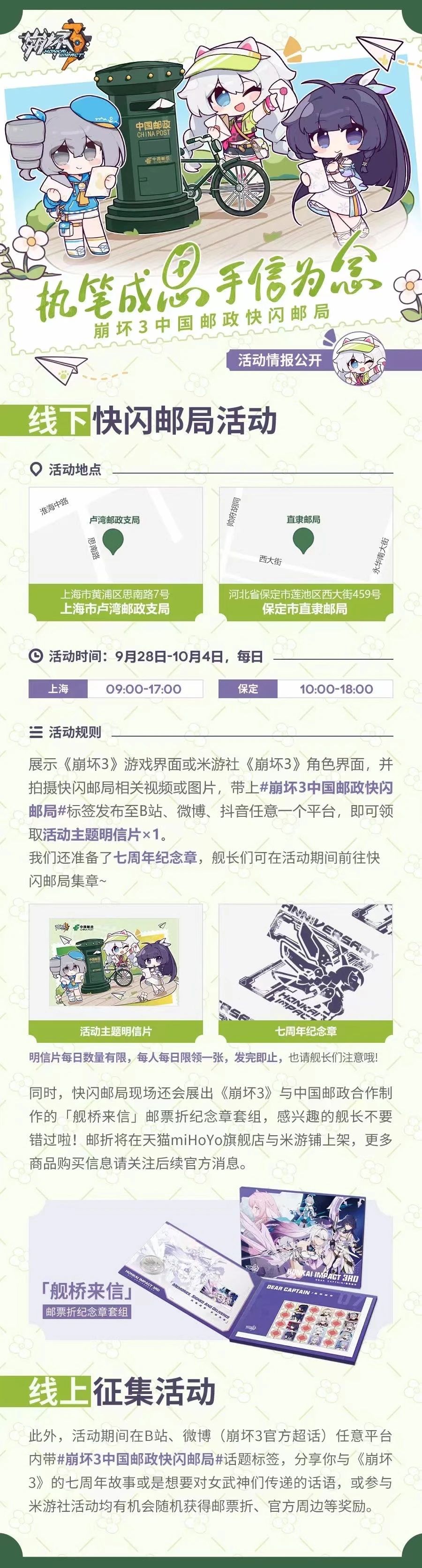 据了解,本次开张的“中国邮政崩坏3快闪邮局”活动将持续到10月4日,并同步在河北保定设立快闪邮局,开启跨省线下体验联动,在中秋节、国庆节期间进行以“执笔成思,手信为念”为主题的系列活动,让更多年轻人通过活动了解中国传统书信文化、感受文字的魅力。
