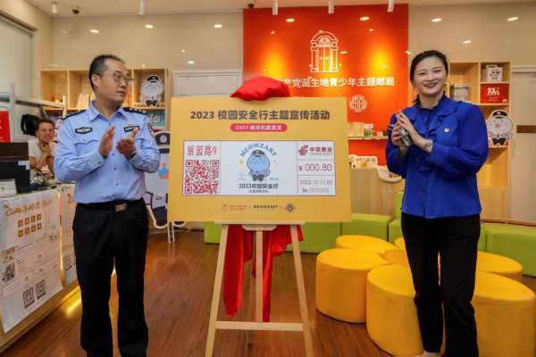 根据公安部高校校园安全、反诈骗防范工作指导意见,为更好提高大学生的诈骗防范意识,今天(10月11日)上午,上海邮政携手上海市公安局文化保卫分局沪西高校派出所、小小喵扎特共同推出的“2023 校园安全行主题宣传活动”在位于上海市黄浦区鲁班路197号的中国共产党诞生地青少年主题邮局正式开启。