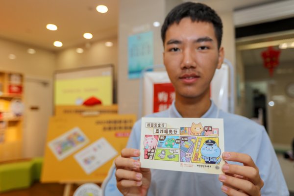 “骗子在进步,我们的反诈宣传不能不进步呀!我从小就喜欢集邮,也喜欢撸猫,这个活动超有意义!”面对镜头,目前就读于复旦大学的大二学生韩宇鑫兴奋地说道。作为“复旦大学爱和猫协”协会会员的他早早来到这里,为的就是第一时间收集到此次活动发行的明信片和邮资机戳,也为一睹“喵警官”的风采。