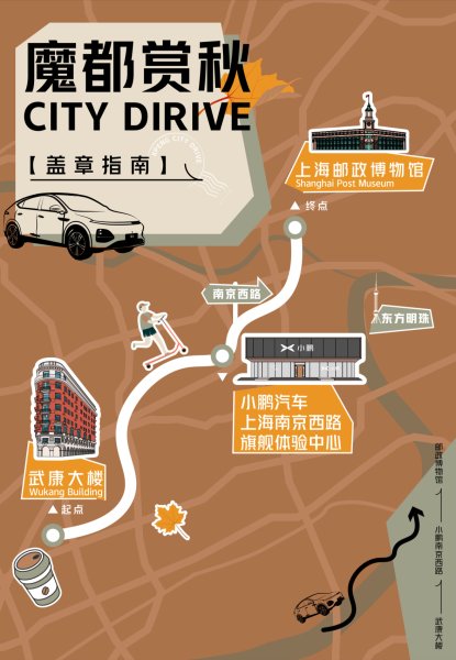 10月12日至10月18日,上海邮政联手小鹏汽车在上海网红打卡点开展了一场秋日漫步——集邮盖章的城市行走活动。主办方设计了三个知名的city walk/ city drive路线,跟着活动路线,可以在秋意的街头领略梧桐区的静谧秋天、感受海派文化,又可以了解苏州河畔的远东第一大厅、get魔都四件套的神仙拍照机位,以及最繁华时髦的南京西商业街区。