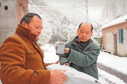 “哇,好大的雪呀!”1月22日晨,浙江省金华市的百姓为眼前的雪白一片所震惊,“十多年了,都没见到过这么大的雪了!”整个金华市城乡都盖上一件厚厚的“雪衣”。通往婺城区安地镇山村的公路已经被交警拦住,普通车辆禁止上山。此时,只有一抹“绿色”在一步一步走进山村。这是金华市邮政分公司安地投递班的邮递员在给村民送去邮件。