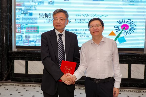 △上海邮政博物馆馆长徐镔接受吴振国捐赠,并颁发捐赠证书