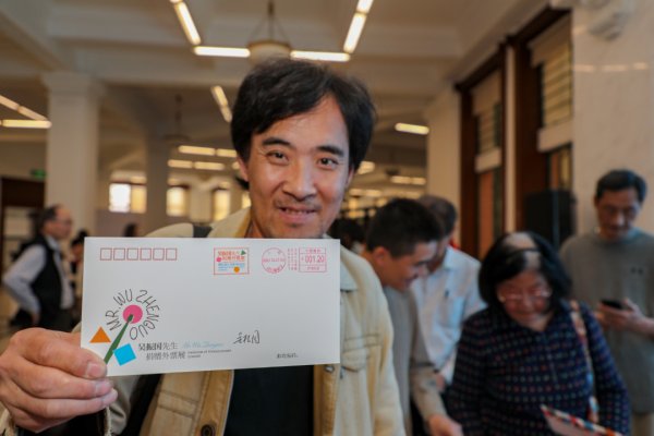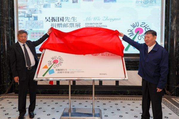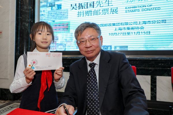 △吴振国与上海市集邮协会名誉会长王观錩共同为本次捐赠仪式纪念封揭幕