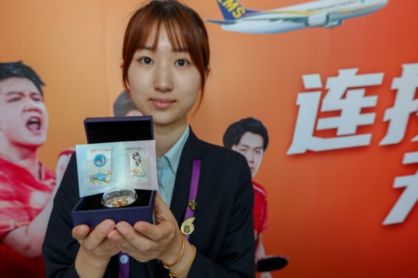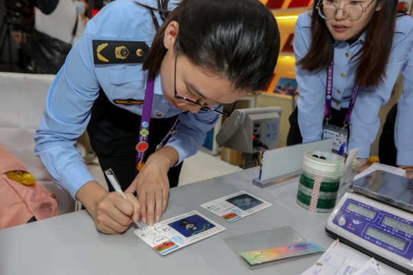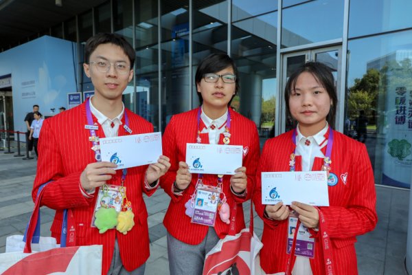 △国家会展中心内的志愿者“小叶子”们展示他们刚刚买到的纪念封和纪念戳。