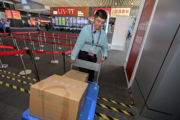 △进博会期间,上海市邮政分公司为参展的大体量企业客户提供上门收件、打包封装、邮件驳运服务。