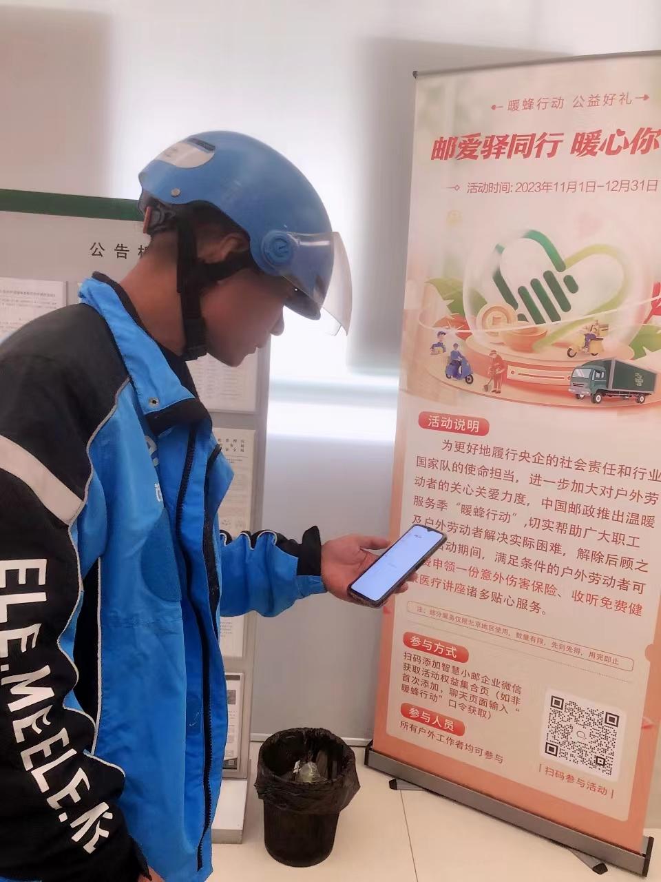 上海邮政工会发挥邮政点多面广的优势,以邮政户外爱心接力站、营业部、支局、网点为依托,全面展开“暖蜂行动”宣传工作,组织户外劳动者观看健康生活科普视频,免费申领保额30万的交通意外伤害险、保额10万的团体意外伤害险及保额3000元的团体附加意外医疗险,让邮政温暖服务的阳光照进每个户外劳动者的心里。
