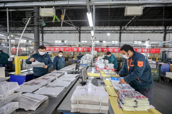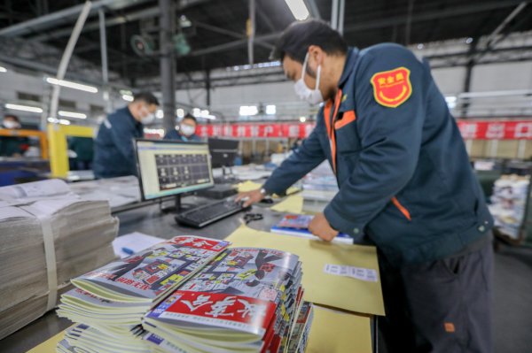 △在位于沪太路的报刊处理场地,邮政工作人员将试点地铁运快递业务的报刊杂志用统一邮袋封装后,并由闵行区邮政分公司押运员运输至延长路地铁站。