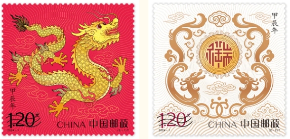 邮票一套两枚,一图名为“天龙行健”,展现了一条昂首奋发的金龙,象征蓬勃向上、自强不息的精神风貌。其形象和姿态源自故宫九龙壁,灵动宛转而不失敦厚威严。金龙身旁饰以寓意吉祥的火焰和祥云纹样并衬以中国红背景,展现出吉庆祥和、纳福迎祥的美好图景;二图名为“辰龙献瑞”,邮票图案源于中国传统吉祥纹样“祥龙拱璧”。画面整体与邮票外形构成“天圆地方”的格局,和谐而庄重。中央玉璧有“祥瑞”二字合文,寓意祥和圆满、福瑞安康。上方的如意纹样传递出和顺致祥之意,下方的水纹、云纹与龙形象共同展现了龙腾四海的宏阔景象,表达出风调雨顺、国泰民安的美好愿望。两枚邮票主打红、金、黑经典三色,体现出了大气、贵气、瑞气和喜气,一动一静、相得益彰。《甲辰年》特种邮票在全市86个指定邮政网点、集邮网厅、中国邮政手机客户端、中国邮政微邮局集邮微信商城和中国邮政商城微信小程序出售,出售期限6个月。为更加丰富地展现邮票内容,中国邮政将通过“中国集邮邮票百科”微信小程序发布数字化内容,邮票收藏爱好者可使用AR功能观看。
